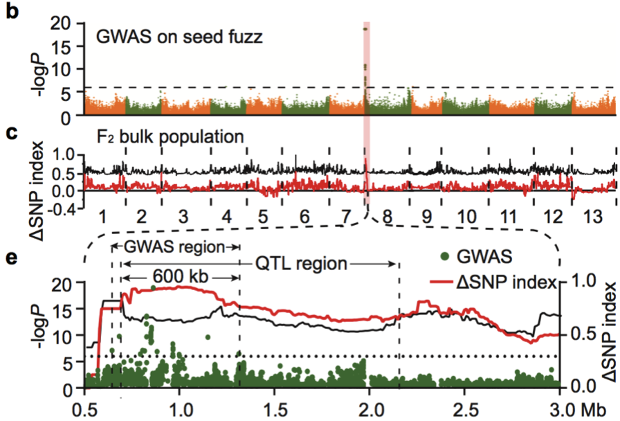 a 亞洲棉種子有絨(左)和無(wú)絨(右)表型;b GWAS關(guān)聯(lián)分析;c F2群體QTL分析;d F2群體的構建 e GWAS和QTL聯(lián)合分析