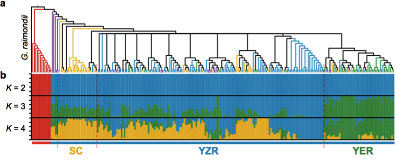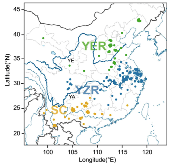 共計選擇了243份二倍體棉花材料:230份亞洲棉G. arboreum (A2) ?和13份草棉G. herbaceum (A1);材料來(lái)源:中國南部(SC),長(cháng)江(YZR)和黃河(這些區域代表了中國二倍體棉花大部分的表型和地理多樣性)。