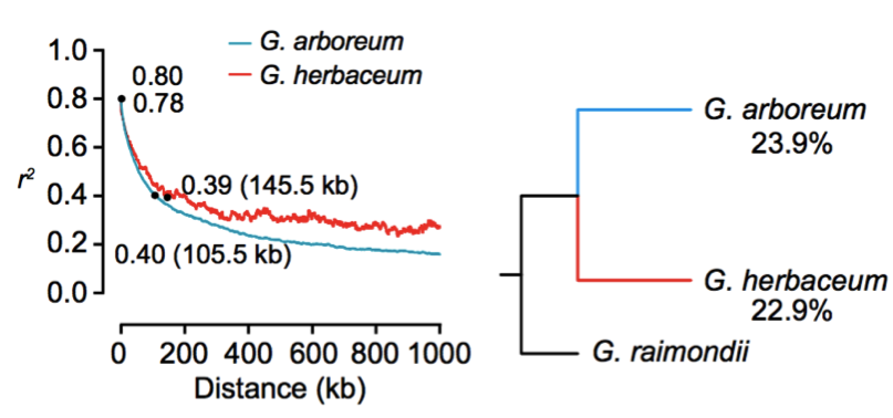 通過(guò)表型計算統計發(fā)現,與長(cháng)江和黃河區域的兩個(gè)不同地區的材料項目,中國南部的材料的表型相對匱乏。此外中國南部SC的亞洲棉(π=0.211×10-3)比長(cháng)江流域YZR(π=0.197×10-3)和黃河流域YER(π=0.199×10-3)的亞洲棉的核苷酸多態(tài)性高,這表明了亞洲棉較早在中國南部地區種植,并進(jìn)一步擴展到長(cháng)江和黃河地區,而這與之前基于SSR分析的結果一致;連鎖不平衡分析結果顯示,亞洲棉的LD衰減距離約為105.5 kb(r2=0.40),草棉的衰減距離約為145.5 kb(r2=0.39)(圖5),其LD衰減距離與大豆(約83 kb)和水稻(秈稻約123 kb;粳稻約167 kb)接近,但遠遠高于栽培玉米(22-30 kb)。大約有23.9%的亞洲棉和22.9%的草棉的等位基因與雷蒙德氏棉的基因組相一致,暗示了亞洲棉與草棉同時(shí)開(kāi)始分化(圖6)。