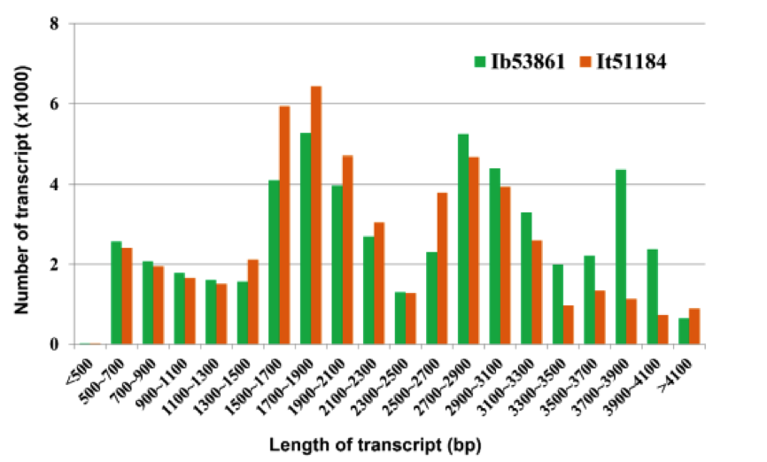 圖3. 在甘薯(Ib53861)和野生甘薯(It51184)中的53,861個(gè)非冗余轉錄物的數量和長(cháng)度分布。