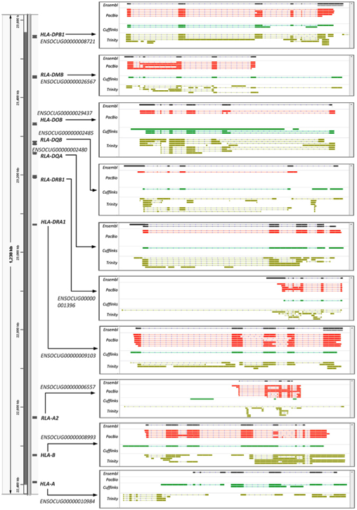 Figure 4.基因通過(guò)PacBio所測轉錄本和組裝得到的轉錄本還原10個(gè)MHC基因。染色體定位、命名和每個(gè)基因的Ensembl編號(在左側)