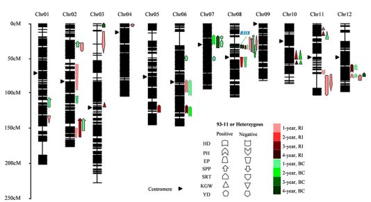 研究人員對多個(gè)雜交水稻組合的產(chǎn)量?jì)?yōu)勢性狀進(jìn)行多年、多地點(diǎn)的綜合分析發(fā)現:每穗小花數和有效穗數是造成兩系雜交稻產(chǎn)量?jì)?yōu)勢的主要原因,而且前者有超親優(yōu)勢,后者只有超父本優(yōu)勢。之后對源自L(fǎng)YP9后代的每個(gè)重組自交系(RIL)群體進(jìn)行重測序的基礎上,構建了一張高分辨率的遺傳連鎖圖,并利用RIL群體及其與母本回交的RILBC1群體進(jìn)行產(chǎn)量相關(guān)性狀的遺傳定位,鑒定了一系列產(chǎn)量及其他優(yōu)勢相關(guān)性狀的QTL位點(diǎn)。同時(shí),結合對幼穗發(fā)育早期的轉錄組分析以及QTL定位的結果,確定了多個(gè)與雜種優(yōu)勢相關(guān)候選基因。此外,還對一個(gè)產(chǎn)量雜種優(yōu)勢的主效位點(diǎn)進(jìn)行了圖位克隆,發(fā)現rice heterosis 8 (RH8) 位點(diǎn)實(shí)際上是由DTH8/Ghd8/LHD1編碼的光周期調控的節律基因,它同時(shí)控制開(kāi)花期、株高、分蘗數,每穗小花數等多種性狀。隨后對361份雜交稻(其中包括125份二系雜交稻)的基因型解析后發(fā)現,RH8的雜合性是兩系法雜交稻基因型的主要類(lèi)型。