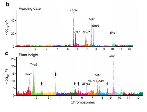作者通過(guò)對1495份雜交稻品種材料中17套代表性雜交稻產(chǎn)生的10074 F2遺傳群體進(jìn)行基因組測序和田間產(chǎn)量性狀考察,綜合QTL定位及GWAS分析,鑒定出了控制水稻雜種優(yōu)勢的主要基因位點(diǎn)HD3a、TAC1、LAX1、Ghd8等 。進(jìn)一步研究表明,水稻中雜種優(yōu)勢的表現正是由這些基因位點(diǎn)所決定,在雜交配組中,這些基因位點(diǎn)產(chǎn)生了全新的基因型組合,在雜交一代中高效地實(shí)現了對水稻花期、株型、產(chǎn)量各要素的理想搭配。