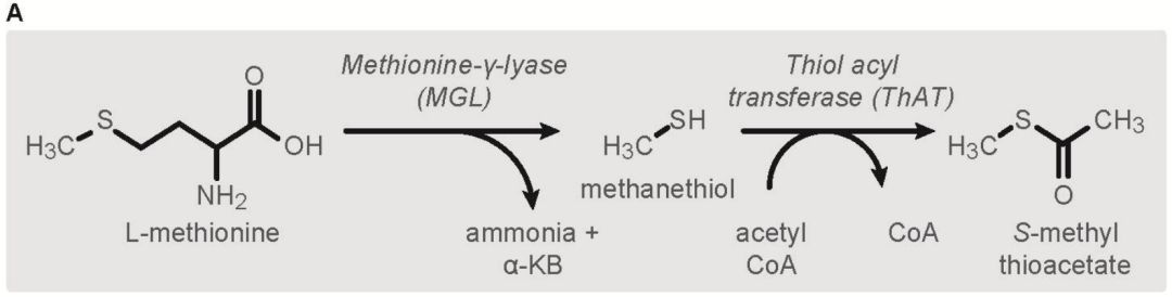 圖3 A)S-methyl thioesters生物合成過(guò)程和B)CmThAT 1定位結果
