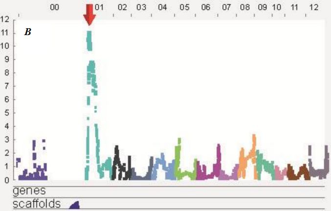 每個(gè)樣品產(chǎn)生5-15M的100bp序列,與參考基因組比對獲得82140個(gè)SNP,甜瓜基因組預測有27427個(gè)基因,本研究共有16000個(gè)基因表達。以SNP為基礎劃bin,所有個(gè)體共檢測到6636個(gè)重組事件,產(chǎn)生3663個(gè)bin(圖1A),bin的平均長(cháng)度為72.6kb。遺傳圖譜構建總圖距為2047cM,利用該圖譜進(jìn)行對之前未能掛載染色體的scffold進(jìn)行掛載,并對部分組裝錯誤進(jìn)行了糾正(圖1B中圓圈)。