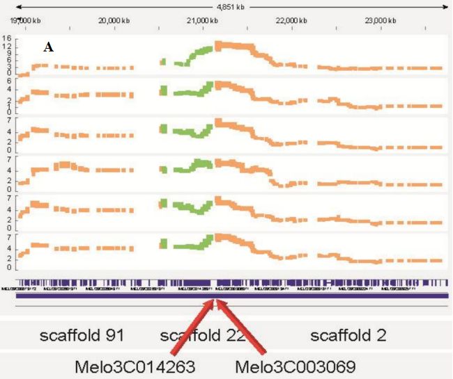 轉錄組測序:授粉10-20天,每個(gè)line取5株甜瓜的果肉混樣提取RNA,Illumina GAII和HiSeq 2000測序