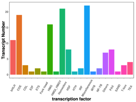 ????????轉錄因子也稱(chēng)反式作用因子,在動(dòng)植物的生長(cháng)發(fā)育及其對外界環(huán)境的反應中起著(zhù)重要的調控作用,通過(guò)轉錄因子注釋或表達量聚類(lèi)分析,挖掘調控生物表型的關(guān)鍵轉錄因子。