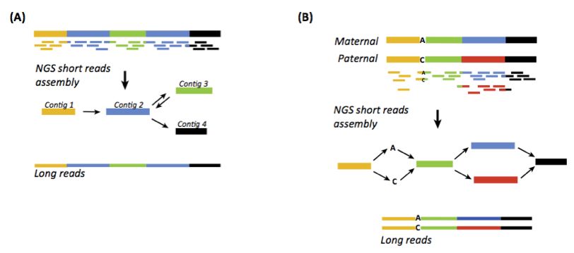 圖1 三代Nanopore測序Long reads解決高重復(A)和高雜合(B)基因組組裝[1]