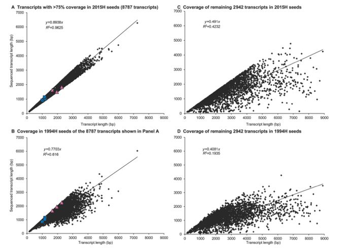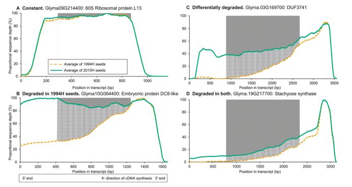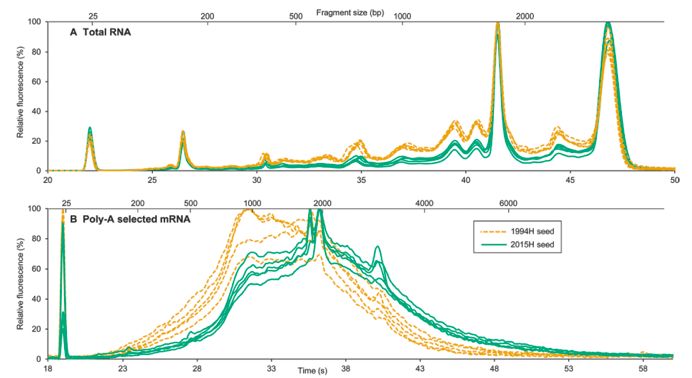 在相隔21年的種子的胚軸中比較mRNA的降解,2015H和1994H分別顯示未衰老和增加衰老癥狀。使用全分子cDNA無(wú)打斷的測序方法對RNA進(jìn)行測序。發(fā)現一些轉錄本在兩個(gè)群組中均有降解,但在1994H種子的組織中觀(guān)察到更多的損傷。損傷主要由于片段碎裂造成,如電泳圖譜的變化,轉錄本覆蓋長(cháng)度和測序深度所示。幾乎沒(méi)有證據表明轉錄本丟失或引起了氧化損傷。降解轉錄本中片段大小的連續分布以及轉錄本長(cháng)度和降解之間的正相關(guān)支持了通過(guò)隨機片段化造成mRNA降解的假設,這與氧化事件引起死亡的假設一致。