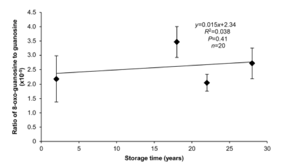來(lái)自5’末端的轉錄本降解可以反映年齡相關(guān)的RNA氧化。最容易氧化的堿基,8-oxo-guanosine的豐度與總RNA中鳥(niǎo)苷豐度的比例與1989,1995,1999和2015年收獲的大豆種子胚軸的貯藏時(shí)間無(wú)關(guān)(圖5)。