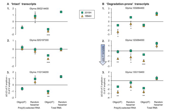 通過(guò)qPCR的方法對區域A(無(wú)降解)的三種轉錄本和區域B的三種轉錄本(僅在1994H種子組織中顯著(zhù)降解)的完整性進(jìn)行驗證,結果顯示:區域A的轉錄本,在組內cDNA文庫中5’和3’擴增的cDNA模板相似,且三個(gè)cDNA文庫ΔCt值沒(méi)有差異,樣本2015H和1994H之間有較小差異。與完整轉錄本相反,對于易于降解的轉錄本,ΔCt值在群組之間顯著(zhù)不同(區域B)。在1994H樣品中,5’比3’擴增模板豐度低,產(chǎn)生負ΔCt值,在2015H樣品中,兩種擴增模板豐富度相似。