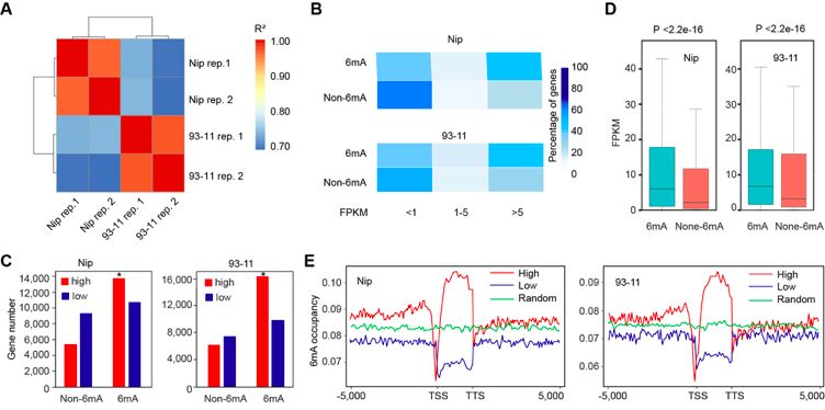 RNA-seq分析表明在Nip和93-11中,在6mA位點(diǎn)有大量的高表達基因甲基化,大量未甲基化基因在低水平表達。6mA甲基化基因的表達水平顯著(zhù)高于非6mA基因,并且高表達基因顯示出較高的6mA占用率,特別是在啟動(dòng)子和基因體區域中包含6mA位點(diǎn)的基因。6mA與水稻中的活性表達基因有關(guān)。5mC在水稻基因組中高豐度存在,影響基因表達,研究發(fā)現5mC和6mA之間沒(méi)有相關(guān)性(圖4)。