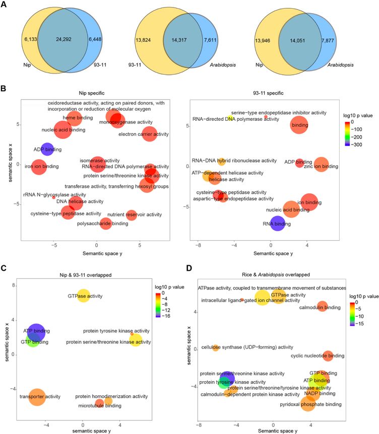 ? ? ??水稻Nip、93-11和擬南芥中6mA分布模式有幾個(gè)關(guān)鍵特征:6mA位點(diǎn)廣泛分布于所有染色體上,在著(zhù)絲粒周?chē)惾旧|(zhì)區域相對富集;在水稻中鑒定的富集motif與擬南芥中的motif非常相似;在水稻和擬南芥中均觀(guān)察到6mA在外顯子富集;6mA與水稻和擬南芥中的活性表達基因相關(guān)。在Nip,93-11和擬南芥中6mA甲基化同源基因比較發(fā)現:大約80%的6mA甲基化基因在Nip和93-11之間重疊,大約一半的水稻(Nip或93-11)的6mA甲基化基因與擬南芥的6mA甲基化基因的三分之二重疊。GO分析表明6mA參與不同生物體中的許多不同功能(圖5)。