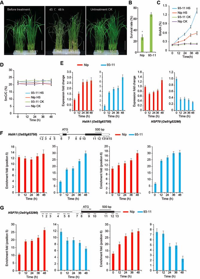 根據SMRT測序結果,篩選出候選的6mA修飾的熱脅迫相關(guān)基因,如熱休克轉錄因子A1(HsfA1)和熱休克蛋白70(HSP70)。HSFA1是熱脅迫反應的主要轉錄調控因子,其在非脅迫條件下受到HSP70的抑制。HSFA1功能缺失導致熱脅迫敏感表型。HsfA1HSP70表達的變化與其6mA水平的變化呈正相關(guān),這可能是Nip和93-11之間熱脅迫耐受性差異的原因。