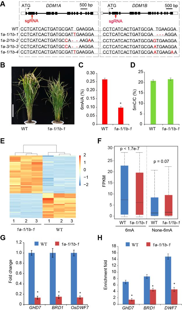 水稻基因組含有兩個(gè)DDM1同源基因DDM1aDDM1b,由于功能冗余,只有T-DNA插入單突變體產(chǎn)生的雙突變體DDM1a/1b表現出發(fā)育表型。然而,DDM1a/1b不產(chǎn)生活花粉,導致種子呈空殼和深色。用CRISPR-Cas9對Nip背景中的DDM1aDDM1b進(jìn)行了有針對性的誘變,并鑒定了10個(gè)獨立的T1系用于DDM1a、DDM1b單突變和4個(gè)獨立的DDM1a/DDM1b(1a/1b)雙突變型。在任何不同類(lèi)型的DDM1aDDM1b純合子單突變體中均未觀(guān)察到表型。與野生型植物相比,所有純合1a/1b系表現出相同的矮化表型。1a-1/1b-1顯示出降低的結實(shí)率,而另外3個(gè)雙突變體顯示不育。LC-MS/MS對DNA甲基化水平的定量測量顯示6mA水平顯著(zhù)降低,但1a/1b植物中5mC水平變化不大。6mA-IPqPCR分析顯示,6mA水平在大多數隨機選擇的位點(diǎn)中顯著(zhù)降低。RNA-seq結果表明野生型中6mA修飾基因的表達水平顯著(zhù)高于1a-1/1b-1植物中的相同基因,野生型中非6mA基因與1a-1/1b-1植物中的相應基因之間沒(méi)有表達水平差異。結果表明6mA水平與基因表達呈正相關(guān)。