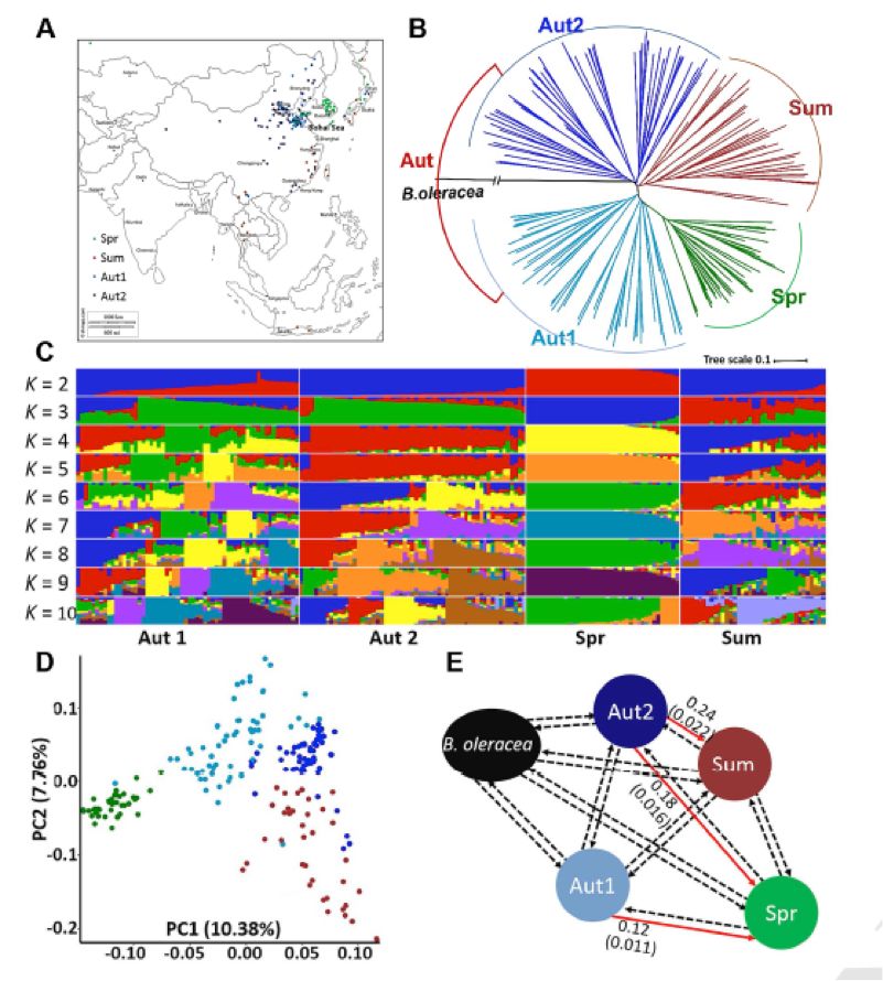 通過(guò)?K分析發(fā)現194個(gè)樣品分成4個(gè)代表種群是較好的模型,增加K值從2到10,等到的模型見(jiàn)上圖C,在K=2或3時(shí),春大白菜能夠清晰的從其他群里分出來(lái),在K=4時(shí),秋大白菜被分為兩個(gè)群,定義為Aut1和Aut2,這個(gè)結果也被主成分分析支持(PCA),如上圖D所示。