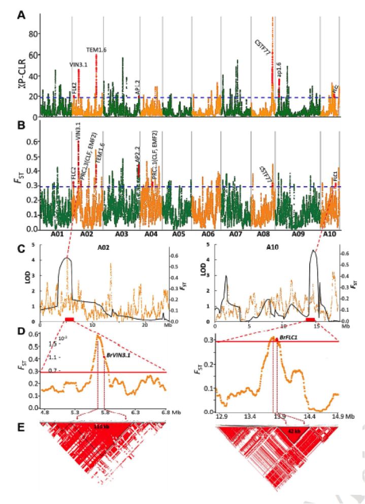 構建了一個(gè)遺傳圖譜進(jìn)行QTL定位以找到抽薹時(shí)間相關(guān)的區域,一共找到了7個(gè)QTLs,其中QTLs ftA02.1 and ftA10.1被發(fā)現在受選擇的兩個(gè)候選區域內。通過(guò)多年對表型變化影響的反復檢測,推測它們參與了抽薹時(shí)間的調控。