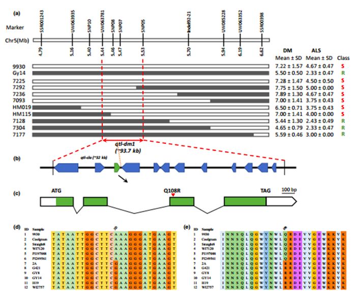 注:a~c為精細定位過(guò)程,d為DNA序列比對,e為蛋白質(zhì)序列比對