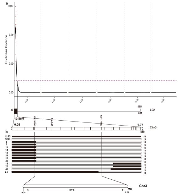 菠菜霜霉病是全球性的一種致命性病害,而抗霜霉病基因的有效利用是病害防治的最根本而有效途徑,因此本研究對報道的菠菜抗病基因RPF1精細定位。在研究中,作者利用菠菜抗霜霉病品種12S3和感病品種12S4,構建F2群體與BC1群體,并通過(guò)SLAF-seq對BC1群體的2個(gè)極端混池?(50+50)?測序,經(jīng)過(guò)BSA分析得到Chr.3上1.72Mb的區間,此區間與之前SLAF-遺傳圖譜的定位結果一致;接著(zhù),利用此區間的SLAF標簽篩選重組單株,并將區域縮小到0.89?Mb;根據注釋信息發(fā)現這個(gè)區間存在14個(gè)抗性基因。為了鑒定到這個(gè)基因,作者又對2個(gè)抗病自交系與3個(gè)感病自交系重測序,通過(guò)序列比對,最終篩選到3個(gè)最可能的候選基因,而qRT-PCR分析發(fā)現其中的2個(gè)基因存在表達差異,這就暗示RPF1基因的確定近在眼前。然而這篇文章就到此為止了,但是作者還在做轉基因方面的驗證工作,相信會(huì )有突破性進(jìn)展。