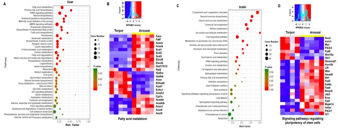 與其它高原哺乳動(dòng)物不同,喜馬拉雅旱獺在冬季冬眠。為了闡述旱獺冬眠的分子機制,研究人員分析了來(lái)自喜馬拉雅旱獺肝臟和大腦的RNA-seq數據,以表征在冬眠/覺(jué)醒周期中基因表達的變化。差異表達的基因(DEGs)顯著(zhù)富集在肝臟中脂肪酸代謝,萜類(lèi)骨架生物合成和初級膽汁酸生物合成的途徑(圖3 A)。并清楚地觀(guān)察到在冬眠狀態(tài)下,參與脂肪酸降解的基因的上調及參與脂肪酸合成的基因的下調,暗示了一個(gè)√確的脂質(zhì)代謝調節機制(圖3 B)。此外,還發(fā)現在覺(jué)醒狀態(tài)下,包含與藥物代謝相關(guān)的基因-細胞色素P450,氨基酸的生物合成和碳水化合物分解代謝相關(guān)基因的總體下調。