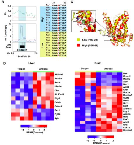 為了更好地了解喜馬拉雅旱獺的高原適應性機制,研究人員從極高海拔(海拔> 4,500 m,n = 10)和相對低海拔(<1,900 m,n = 10)收集了20只喜馬拉雅旱獺。研究人員首先測量了血液參數,發(fā)現與低海拔喜馬拉雅旱獺相比,高海拔喜馬拉雅旱獺的一些血液相關(guān)性狀,尤其是紅細胞計數,血紅蛋白濃度和平均紅細胞體積顯著(zhù)增加。接下來(lái),對每個(gè)喜馬拉雅旱獺進(jìn)行了全基因組測序,并在喜馬拉雅旱獺基因組中搜索了具有高種群分化(Fst)和多樣性比率(qp,low/qp, high)的區域,最終鑒定了分布在喜馬拉雅土撥鼠基因組不同scaffolds?中的24.84 Mb受選擇的區域。這些區域含有383個(gè)功能基因,與非選擇性基因相比,這些基因具有更高的Ka / Ks值(P <0.01),主要功能類(lèi)別包括“缺氧反應”,“DNA修復”,“血管生成”,“心臟功能”,“脂肪酸代謝”,“細胞周期”,“發(fā)熱”和“鈣信號通路”。參與缺氧誘導因子-1(HIF-1),血管內皮生長(cháng)因子(VEGF)或其它缺氧相關(guān)信號通路的10個(gè)功能基因,包括Slc25a14,Nox-1,Hmox1,Vegfr2,Atg16l2,Bex1,Ptgr2,Gprasp1,Fam46d?和Chd3,在高海拔和低海拔群體之間顯示出明顯的基因分型差異(圖4 A)。在Slc25a14中發(fā)現了非同義替換(由Ser28取代Phe28,F28S),其顯示出*強的分化信號(FST = 0.73)(圖4 A和B)?;谕唇5腟lc25a14的三維結構顯示,F28S替換發(fā)生在N末端的loop區域,并且由于氨基的電荷和極性的變化而增加其與相鄰的α-螺旋的距離(圖4 C)。為了進(jìn)一步評估這一變體的功能影響,研究人員將突變體Slc25a14與其在不同哺乳動(dòng)物中的直系同源基因進(jìn)行比對,并發(fā)現Phe28在比對的其它動(dòng)物中高度保守。該突變體功能影響的預測證明F28S取代是有害的,所有這些結果都表明F28S突變可能是高海拔群體Slc25a14選擇性清除的結果。為了推測旱獺高海拔適應和冬眠的遺傳適應性機制,研究人員在選擇性清除區域鑒定到了116個(gè)差異表達基因,在這些基因中,25個(gè)差異表達基因與HIF-1途徑相關(guān),主要屬于DNA修復,血管生成,脂肪酸代謝,細胞凋亡/細胞周期和發(fā)熱的類(lèi)別相關(guān)。在冬眠/覺(jué)醒周期中,大量選擇性清除基因具有差異表達,表明這兩種生物學(xué)過(guò)程之間存在共同的遺傳影響(圖4 D)。在這些基因中,Bex1, Apln, kcne1l, Med12, Dad1和Fgf16在冬眠階段肝臟或腦中顯著(zhù)上調(圖4 D),進(jìn)一步證明這些基因參與冬眠和高原適應性,先前的研究報道了這些基因參與許多生理過(guò)程,包括神經(jīng)元分化,肝再生,血管生成和能量代謝,而這需要進(jìn)一步的實(shí)驗驗證。