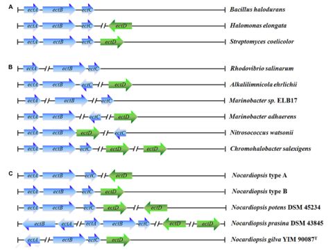 對四氫嘧啶和羥基四氫嘧啶合成基因ectABCD進(jìn)行種屬分析。其中在18個(gè)擬諾卡氏菌系中存在2個(gè)常見(jiàn)的ectABCD基因簇類(lèi)型。ectABC屬于一個(gè)基因簇,而ectD則位于基因組的其他位置(type A, 15 strains),又或者ectABCD歸屬于相同的基因簇(type B, 3 strains)。此外,在N. potens?DSM 45234和N.prasina?DSM 43845菌系中發(fā)現至少一個(gè)ectAB或ectD基因。然而,在N.gilva?YIM 90087T中,基因簇類(lèi)型卻與其他菌系顯著(zhù)不同。ectA基因完全與ectBCD基因簇分開(kāi),且ehuABCD(四氫嘧啶和羥基四氫嘧啶ABC轉運受體基因)位于ectD基因的下游。