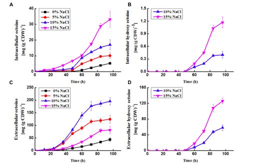 將重組質(zhì)粒轉入大腸桿菌中,發(fā)現在15%的NaCl緩沖液中,四氫嘧啶很難產(chǎn)生,并在0%的緩沖液中檢測到少量四氫嘧啶。在10%和15%的鹽濃度環(huán)境下,四氫嘧啶的合成速率分別在24h和48h中顯著(zhù)下降,其最大合成速率為[0.5 mg (g CDW)?1?h?1],而最終產(chǎn)出[28.85 mg (g CDW)?1]?。