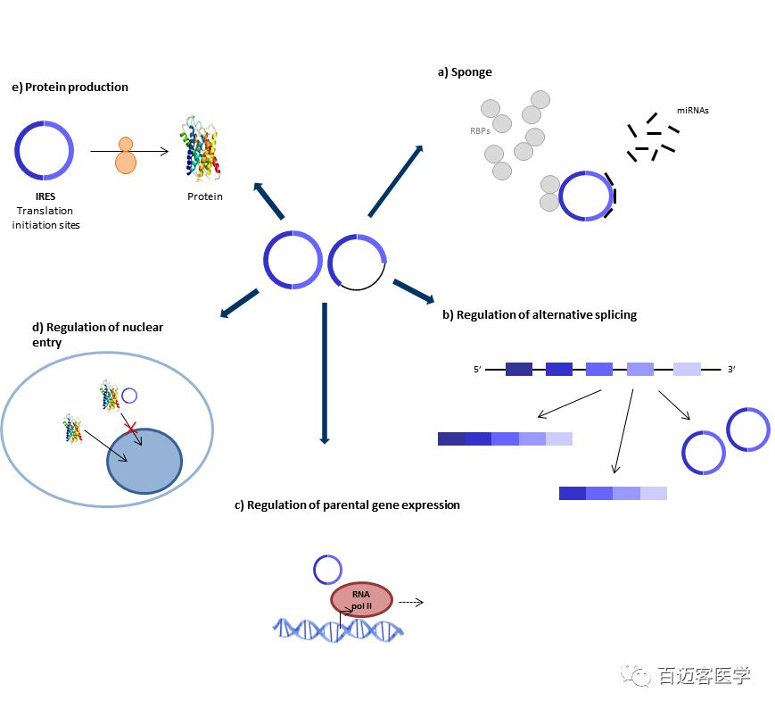 關(guān)于circRNA的功能,探討最多的就是對其它基因表達調控因子的“海綿”作用,尤其是可以直接結合并調控基因表達的miRNA,所謂“海綿”作用,就是circRNA可以結合miRNA,從而影響miRNA對基因表達的調控。此外,有研究證明它們也可以直接調控轉錄、干擾剪接機制。