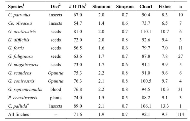表1.?達爾文雀的樣本大小、食性分類(lèi)以及α多樣性