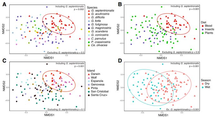 圖4. NMDS:達爾文雀種類(lèi)(A)、攝食習性(B)、島嶼(C)以及旱、雨季度(D)對達爾文雀腸道微生物的影響。(基于97%相似度OUT聚類(lèi),橢圓置信度90%)