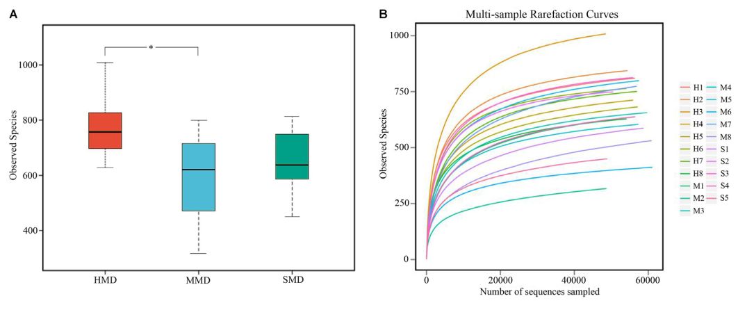 1、結果16S-rRNA基因測序結果分析從8個(gè)HMD,8個(gè)MMD和5個(gè)SMD糞便樣品中獲得總共1,165,731個(gè)高質(zhì)量序列,并且從每個(gè)樣品獲得48,489-61,048個(gè)分析序列(平均長(cháng)度= 406.3bp)。HMD,MMD和SMD中觀(guān)察到的物種(OTU)顯示在圖1A中,每個(gè)樣品的平均OTU數為675±160。本研究中檢測到的數量表明物種的數量隨著(zhù)測序深度的增加而增加。稀釋曲線(xiàn)的末端隨著(zhù)每個(gè)樣品的序列數量的增加而逐漸減少(圖1B)。得到的OTU在Silva數據庫中進(jìn)行比對注釋?zhuān)詈蟮玫降募毦饕譃?6門(mén),26類(lèi),43目,63科和160屬。結果表明,健康麝的腸道微生物具有較高的細菌多樣性,而腹瀉麝的細菌多樣性較低。因此,腸道微生物中細菌物種的豐富性和多樣性是“健康”的重要組成部分,它們在維持腸道微生態(tài)系統的動(dòng)態(tài)平衡和確保正常生理功能方面有重要作用。
