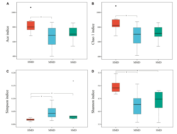 麝鹿糞便樣本中Alpha多樣性指數(Ace,Chao 1,Simpson和Shannon)(圖2)和健康和腹瀉的樣本β多樣性指數統計結果顯示:HMD和MMD之間的Ace、Chao 1、Simpson和Shannon指數存在顯著(zhù)差異(P <0.05)。MMD和SMD之間沒(méi)有顯著(zhù)性差異。HMD和SMD的比較發(fā)現有顯著(zhù)性差異(P <0.05)。