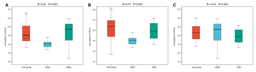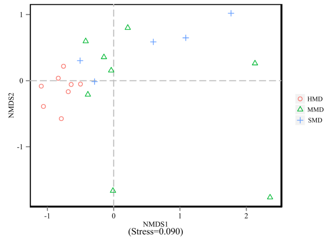 組間和組內β距離在箱型圖中顯示(圖4),結果表明HMD和MMD組(圖4A)之間以及HMD和SMD組之間細菌群落的極顯著(zhù)差異(圖4B)(?P <0.01)。