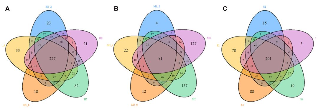 物種分類(lèi)柱狀圖是表示HMD、MMD和SMD樣本中物種的組成及對應物種在該樣本中的相對豐度。HMD、MMD和SMD樣本中在門(mén)水平和屬水平相對豐度前10的物種如圖5所示。無(wú)論是否存在腹瀉的樣本中,厚壁菌和擬桿菌都是主要的優(yōu)勢菌。然而,健康森林麝的糞便中厚壁菌的相對豐度明顯高于腹瀉麝。厚壁菌是構成食物中纖維素分解代謝并將纖維素降解為宿主揮發(fā)性脂肪酸的主要細菌類(lèi)型。此外,厚壁菌門(mén)還可以調節體內免疫反應,抑制病原體的侵襲和預防腸道炎癥。腹瀉麝腸道中厚壁細胞豐度的減少可能會(huì )同時(shí)降低該物種的消化生理功能。另外,β多樣性的比較顯示,健康和腹瀉森林麝的細菌群落差異極顯著(zhù),這與麝的異常消化生理功能有關(guān)。HMD、MMD和SMD三組不同樣本之間共有OTU和特有OTU數量如圖6所示。