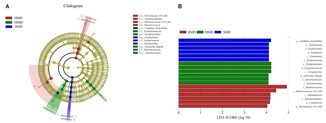 LefSe分析表明(圖7),在屬的水平上,MMD組與HMD和SMD組之間顯著(zhù)性差異較大的菌種為埃希氏菌?–?志賀氏菌。埃希氏菌屬?–?志賀氏菌是常見(jiàn)的病原體,其主要的傳播途徑包括:受感染對象的糞便、食物和含有細菌的水。該病原體可引起結腸粘膜炎癥,導致腹痛、腹瀉和形成粘膜糞便等癥狀。因此,用于喂養麝的食物和水以及糞便管理是減輕輕度腹瀉的關(guān)鍵。另外,SMD組與HMD和MMD組之間顯著(zhù)性差異較大的菌種為梭桿菌。梭桿菌是炎癥性微生物,它可抑制體內T細胞應答并促進(jìn)炎性因子的表達。比較MMD組和SMD組,可以推測Fusobacterium可能在輕度腹瀉的背景下增殖并成為主要病原體。因此,森林麝的腸道生理紊亂與其主要病原體的類(lèi)型是存在一定的相關(guān)性的。
