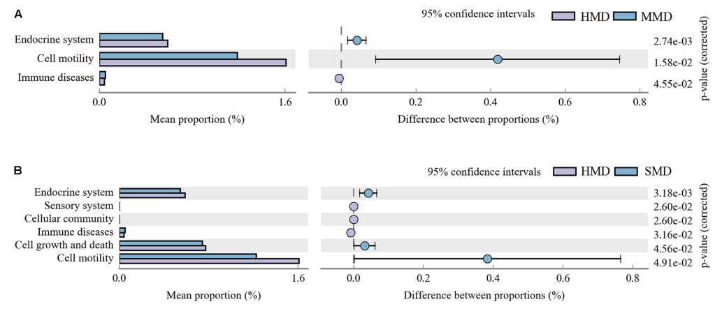 FIGURE 8 | (A) The abundance ratio ofdifferent functions between HMD and MMD. (B) The abundance ratio of differentfunctions between HMD and SMD.
