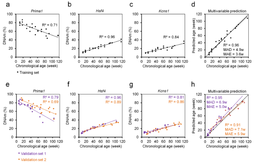 該研究從上述研究及其他研究中的基礎上選擇了9個(gè)甲基化區域在不同年齡段的小鼠血液樣品中進(jìn)行焦磷酸測序,建立年齡預測的模型,最后選擇了3個(gè)CpG位點(diǎn)(Prima 1, Hsf4, Kcns 1)來(lái)預測小鼠的年齡和壽命。