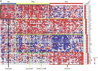 該研究共鑒定到11340個(gè)不同的基因產(chǎn)物,覆蓋了腫瘤細胞及腫瘤微環(huán)境所有可能表達的蛋白。研究人員對胃癌與癌旁組織全蛋白表達譜進(jìn)行聚類(lèi)分析,將彌漫型胃癌分為三個(gè)分子亞型(PX1~3),且這三個(gè)亞型與生存預后和化療敏感性密切相關(guān)。這是世界上實(shí)現在蛋白層面上對腫瘤進(jìn)行分子分型,且分的的亞型與預后和化療有顯著(zhù)性關(guān)聯(lián)。其中PX1型(細胞周期型),總生存時(shí)間最長(cháng);PX2型 (上皮-間充質(zhì)轉化型),生存預后介于PX1和PX3之間;PX3 (免疫通路富集型)患者腫瘤組織高表達蛋白富集在免疫響應相關(guān)通路和EMT相關(guān)蛋白上,總生存時(shí)間最短,并且該組患者對化療不敏感。