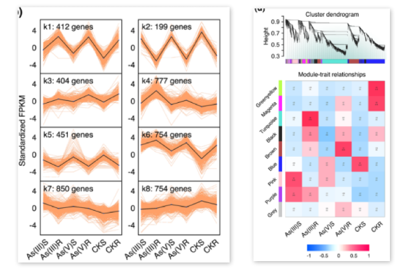 對不同處理不同組織部位進(jìn)行兩兩比較(CKS-As(III)S、CKR-As(V)S、CKS-As(III)R和CKRAs(V)R),共計獲得4,601個(gè)差異表達基因。通過(guò)K-means算法進(jìn)行富集分析,6個(gè)cluster中的共2,997(65.1%)個(gè)DEGs在根和地上部出現相反的表達模式:其中k1、k3、k4和k6以地上部表達模式為主,其生物學(xué)功能包括光合作用等;而k2和k5以根部表達模式為主,參與ABC轉運等功能。