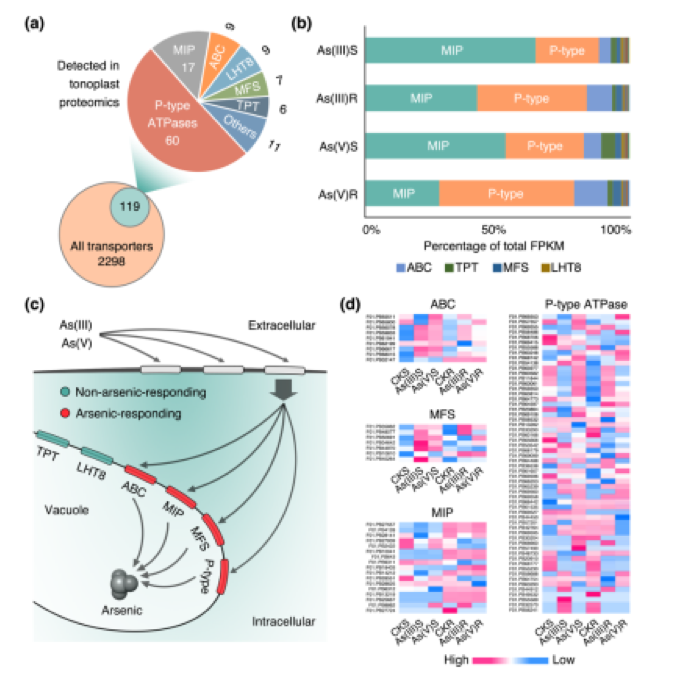 通過(guò)使用全長(cháng)轉錄本構建蛋白數據庫,對液泡膜蛋白進(jìn)行重新注釋?zhuān)舱业?3,595液泡膜蛋白肽段,比對到1,512個(gè)轉錄本,其中鑒定到包括P-type ATPase、MIP、MFS、ABC、丙糖-磷酸鹽和賴(lài)氨酸-蘇氨酸轉運受體8等6個(gè)轉運家族在內的119個(gè)液泡膜轉運蛋白。其中有四個(gè)轉運蛋白家族表現出高表達水平且與砷處理應答有關(guān):絕大多數的 MIP和P-type ATPase轉運蛋白有著(zhù)更高的表達水平,而ABC和 MFS轉運蛋白則在砷刺激后在地上部或根部表達上調。以上結果表明這些轉運蛋白家族在液泡膜上對砷的超富集起到重要作用。