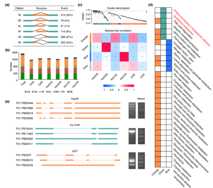 本研究共鑒定到1,482個(gè)可變剪接事件,并分為六類(lèi)包括:內含子保留(RI)、外顯子跳躍(SE)、最后外顯子可變剪切(AL)。第一外顯子可變剪切(AF)、3’端可變剪接位點(diǎn)(A3)和5’端可變剪接(A5)。WGCNA分析結果共分為四個(gè)模塊(橙色、綠色、藍色,灰色)。在地上部,所有樣本都與橙色模塊相關(guān),而在根部,綠色模塊與As(III)R顯著(zhù)相關(guān),藍色模塊與AS(V)R顯著(zhù)相關(guān)。對不同模塊進(jìn)行KEGG富集分析得知,內質(zhì)網(wǎng)蛋白質(zhì)加工通路和GSH代謝兩個(gè)最重要的通路,顯著(zhù)富集在綠色模塊。通過(guò)PCR對相關(guān)可變剪切進(jìn)行鑒定,結果表明可變剪切極大的豐富了轉錄本的數量,在錯誤折疊蛋白降解過(guò)程和GST的表達上起調控作用。