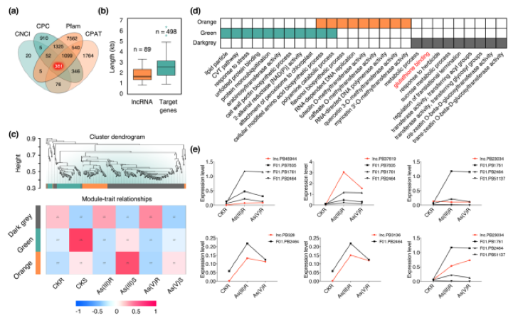 ????此外,本研究還鑒定到381個(gè)不同長(cháng)度的lncRNA。通過(guò)WGCNA進(jìn)行lncRNA與靶基因間的共表達和相關(guān)性分析得知:來(lái)自AS(III)S處理組的lncRNAs及其靶基因主要與橙色模塊相關(guān),CKS主要與綠色模塊相關(guān),而來(lái)自根部的則與深灰色模塊相關(guān)?!肮入赘孰慕Y合”條目富集在深灰色模塊,表明蜈蚣草根系中的lncRNA可能參與了GSH結合的調控。通過(guò)qRT-PCR進(jìn)行定量分析可知,根中與GST相關(guān)的lncRNA-mRNA表達水平呈正相關(guān),表明lncRNA和其GST靶基因間存在調控作用從而保證根部的抗砷性。