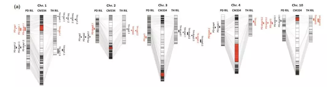QTL定位結果:利用120個(gè)PD單株構建的重測序遺傳圖譜和3個(gè)環(huán)境下的56個(gè)單株表型數據定位到22個(gè)QTL位點(diǎn)。其中LOD值最高的是PD-dicap1.1 (LOD=8.7),表型變異率(R2)最高的是PD-dicap10.2 (28.8%)。同樣地,85個(gè)TH單株構建的簡(jiǎn)化圖譜和2個(gè)環(huán)境的表型數據定位到22個(gè)QTL位點(diǎn)。其中LOD值(LOD=9.9)和R2(18.8%)最高的都是TH-cap2.2。兩者分析時(shí)均用CM334作為參考基因組,因此可以對2個(gè)群體的QTL定位結果進(jìn)行比較,發(fā)現PD群體的9個(gè)QTL位點(diǎn)與TH群體的7個(gè)QTL位點(diǎn)的物理位置重疊。