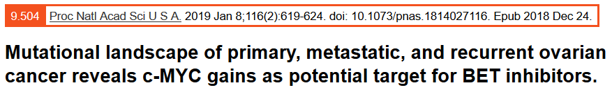 Li C, Bonazzoli E, Bellone S, et al. Mutational landscape of primary, metastatic, and recurrent ovarian cancer reveals c-MYC gains as potential target for BET inhibitors[J]. Proceedings of the National Academy of Sciences, 2019, 116(2): 619-624.