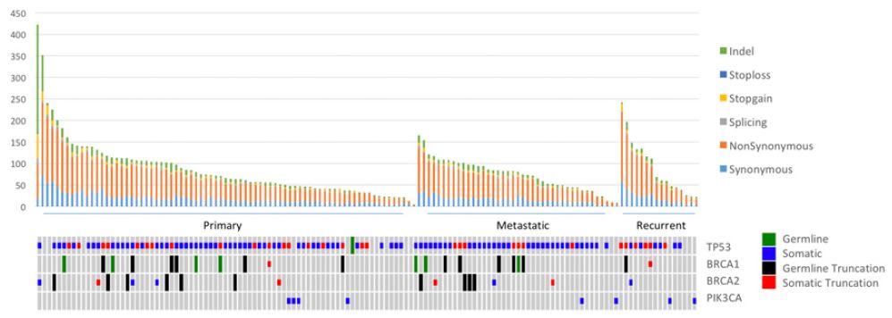 1、研究者通過(guò)全外顯子組測序(WES)分析了來(lái)自77名單側卵巢癌患者的122例新鮮凍存腫瘤組織(64個(gè)原發(fā)灶,41個(gè)轉移灶和17個(gè)復發(fā)灶,其中原發(fā)灶中含有分別與轉移灶和復發(fā)灶相匹配的樣本)以及匹配的正常DNA(來(lái)自靜脈血等)的突變情況。