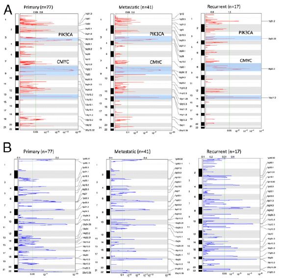 成對外顯子測序數據SCNA分析表明,在原發(fā)灶與復發(fā)灶匹配的17名患者中,4名患者獲得了PIK3CA擴增(3q26),2名患者在復發(fā)腫瘤中獲得了c-MYC擴增(8q23-24)。GISTIC分析表明,PIK3CA和c-MYC擴增在樣本間具有顯著(zhù)重現性,其頻率在復發(fā)灶、轉移灶和原發(fā)灶依次降低。