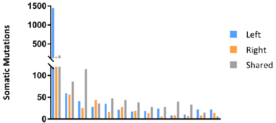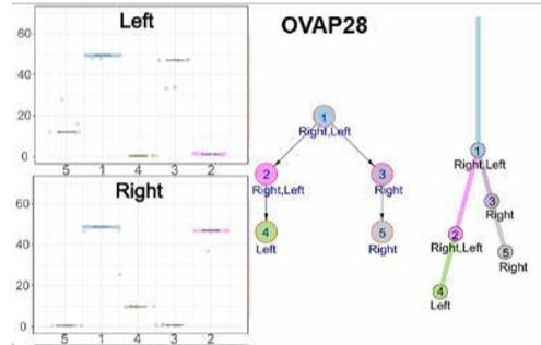 2、研究者也對13對雙側卵巢癌(synchronous bilateral ovarian cancer,SBOC)進(jìn)行了測序,評估腫瘤克隆進(jìn)化,以確定左右兩側腫瘤是否獨立地作為2個(gè)不同的腫瘤,還是分別代表原發(fā)性和轉移性腫瘤。分析表明,體細胞突變在2側腫瘤廣泛共享,所有病例中均顯示2側腫瘤起源于共同的祖先。