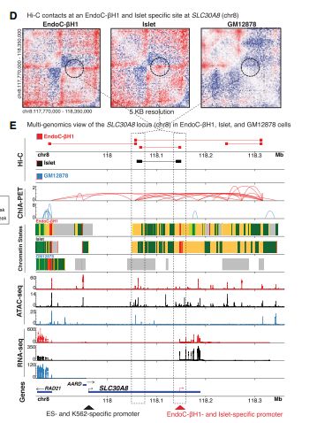 多組學(xué)分析結果在不同細胞中的比較。Hi-C互作表明在 EndoC-bH1 和人原代胰島SLC30A8位點(diǎn)有特異性loop,但在GM12878中缺乏。