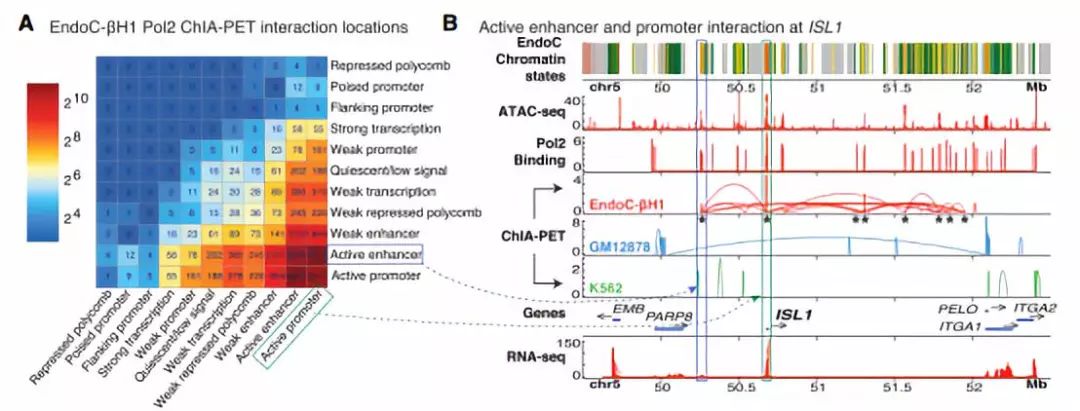 為示意功能性順式調控網(wǎng)絡(luò ),文中在EndoC-bH1中采用RNA聚合酶(Pol2)ChIA-PET,鑒定了25,336個(gè)推定的Pol2介導的染色質(zhì)互作。進(jìn)一步過(guò)濾,與ATAC-seq OCRs取交集,得到16,756個(gè)互作,大多數與活性增強子和啟動(dòng)子關(guān)聯(lián)。且與已在人胰島中報道過(guò)的互作一致,包括 ISL1和PDX1位點(diǎn)。
