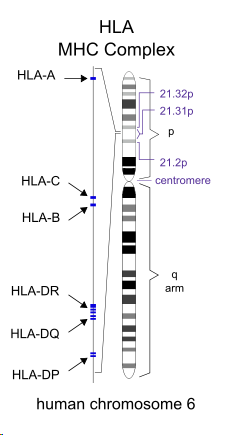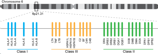 HLA全長(cháng)約3.6M,含有220多種功能不同的基因,是目前已知的人類(lèi)染色體中基因密度最高、多態(tài)性最為豐富的區域,位置示意圖如下: